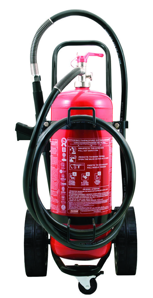 Τροχήλατος Πυροσβεστήρας 25Kg Ξηράς Σκόνης ABC40%, με Λάστιχο Εκτόξευσης Υλικού 5 μέτρων, Με κλείστρο με Βαλβίδα Ασφαλείας Μανομέτρου, Οδηγίες Χρήσεως & Συντήρησης σε Μεταξοτυπία
